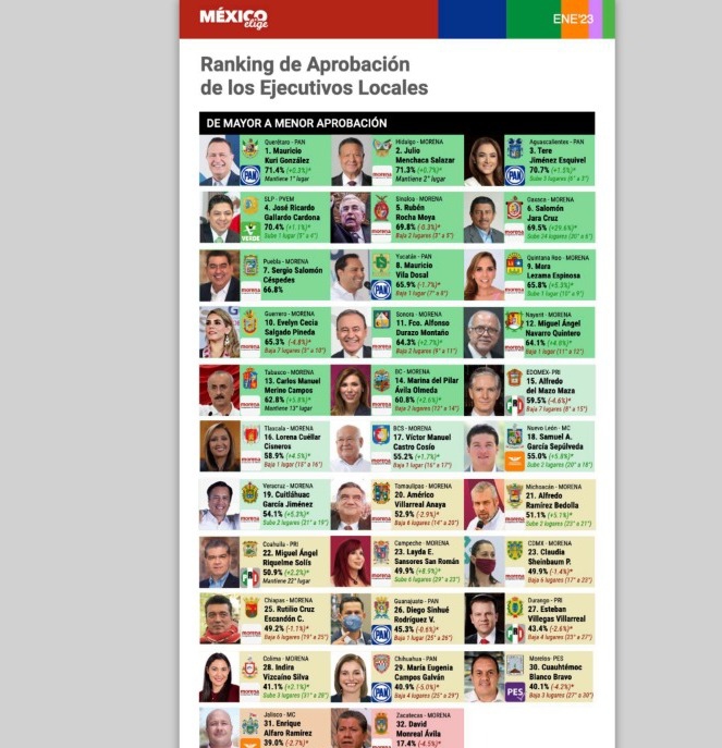 México Elige, lo ubicó en el cuarto lugar nacional con un 70.4 de calificación positiva, con lo que avanza en el ranking de las y los mandatarios estatales