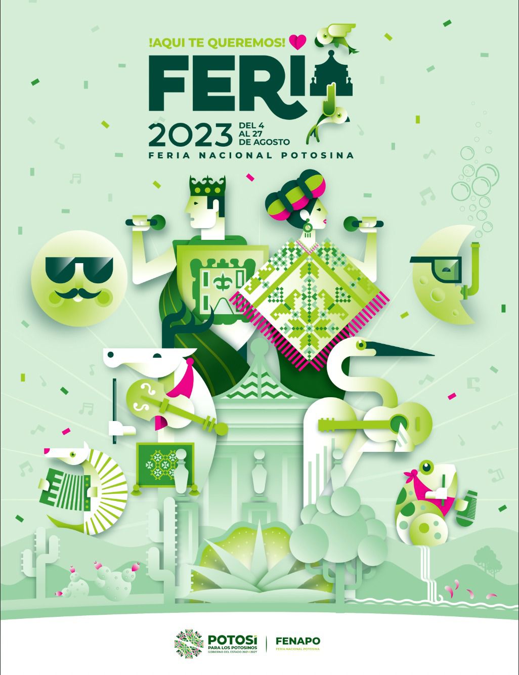 Resultado de la visión integradora y del apoyo a las y los potosinos que se ha logrado con la actual administración estatal, el nuevo cartel de la de la Feria Nacional Potosina (Fenapo) 2023, integra en su diseño elementos que caracterizan al Estado, la cultura, historia, el contraste de la flora y fauna de las regiones con una presentación de música y fiesta que caracteriza las festividades de San Luis Rey de Francia.