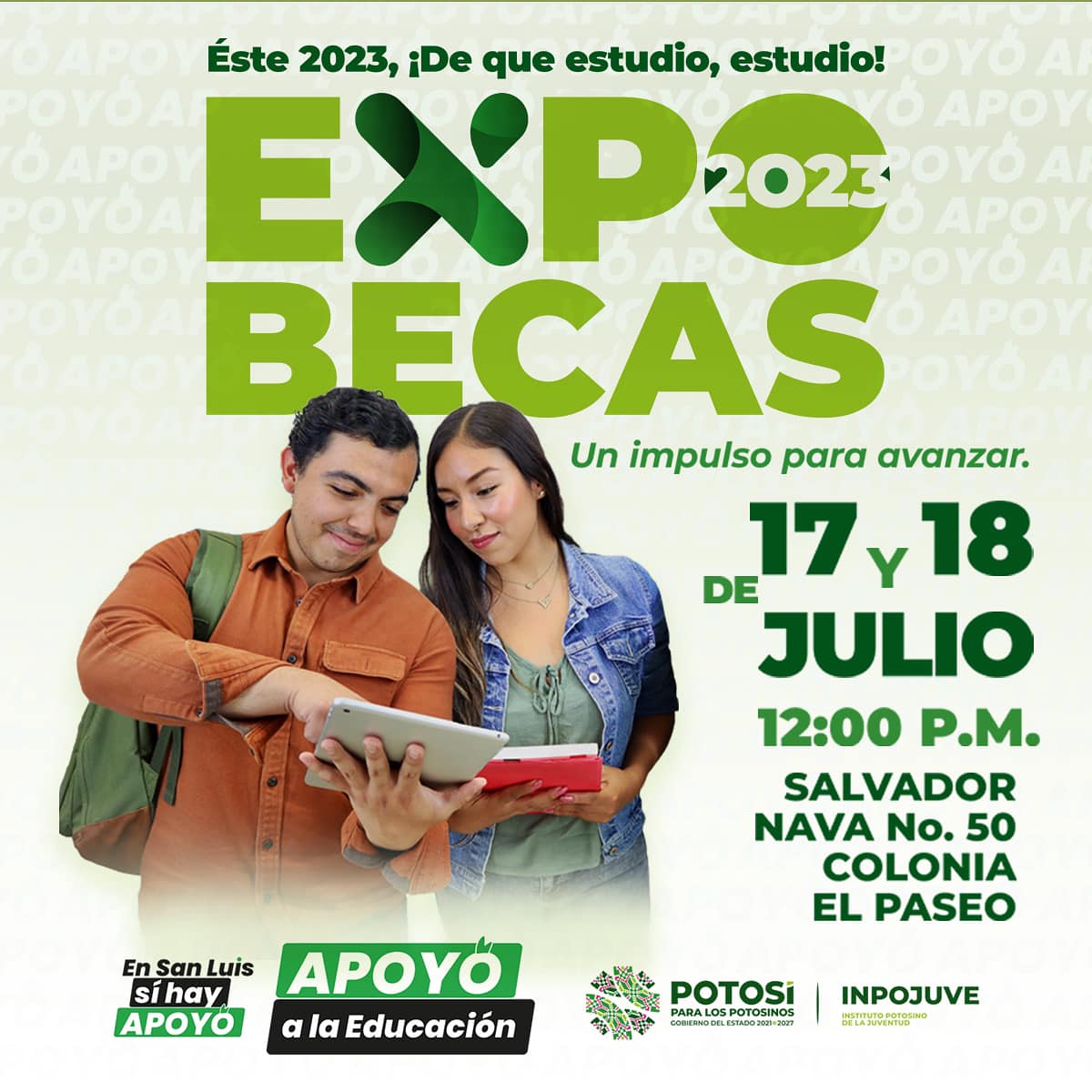 Bajo el lema “De que estudio, estudio” y confirmando que la juventud de hoy en día tiene un aliado en el Gobierno del Estado personificado en el líder del Poder Ejecutivo en la entidad, Ricardo Gallardo Cardona, el Instituto Potosino de la Juventud dio a conocer que se estará llevando a cabo la “Expo becas” 2023.