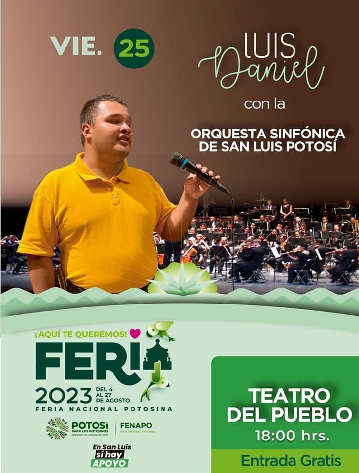 Como parte del apoyo a cantantes y artistas potosinos que promueve el Gobierno Estatal, Luis Daniel, quien se hizo viral por interpretar canciones de Luis Miguel, se dijo listo para presentarse en el escenario de la máxima fiesta de las y los potosinos, acompañado por una de las orquestas más reconocidas a nivel Latinoamérica como la Orquesta Sinfónica de San Luis Potosí, encabezada por el maestro José Miramontes Zapata.