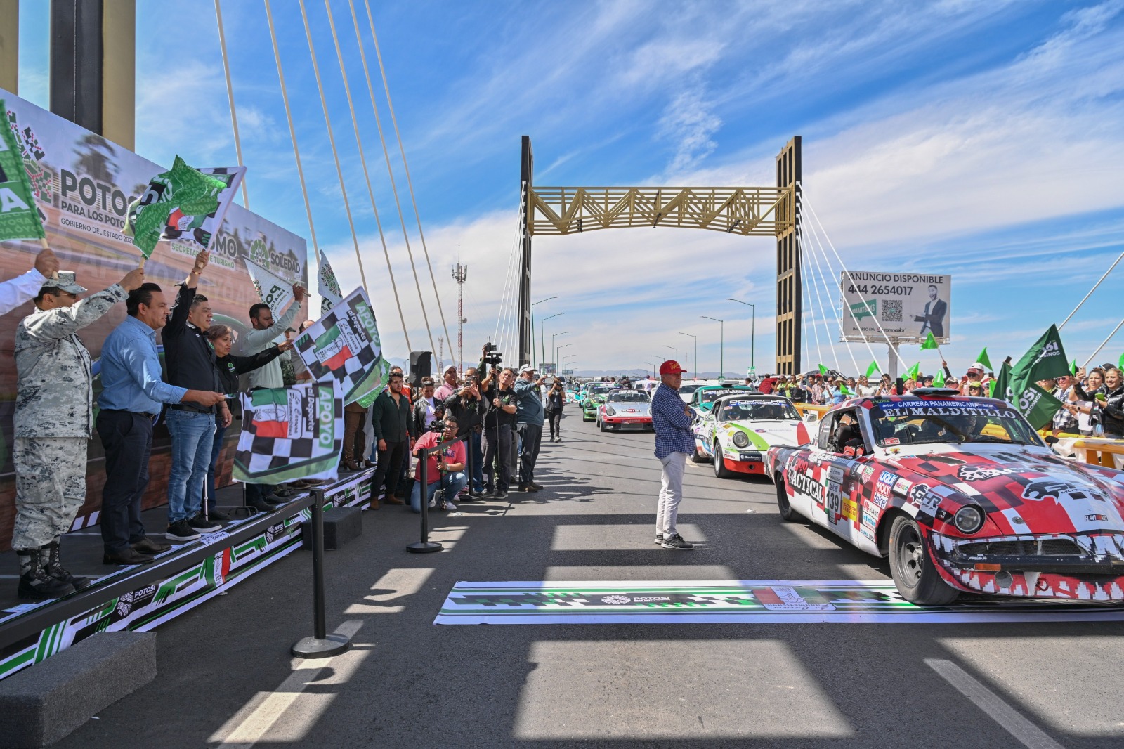 Ante miles de entusiastas seguidores al automovilismo deportivo, el Gobernador de San Luis Potosí Ricardo Gallardo Cardona, encabezó el banderazo de arranque de la Carrera Panamericana 2023 etapa San Luis Potosí-Monterrey, sobre el puente vehicular atirantado en Quintas de la Hacienda, donde desfilaron cerca de 100 autos deportivos clásicos, que con el rugir de los motores, emocionaron a las y los seguidores.