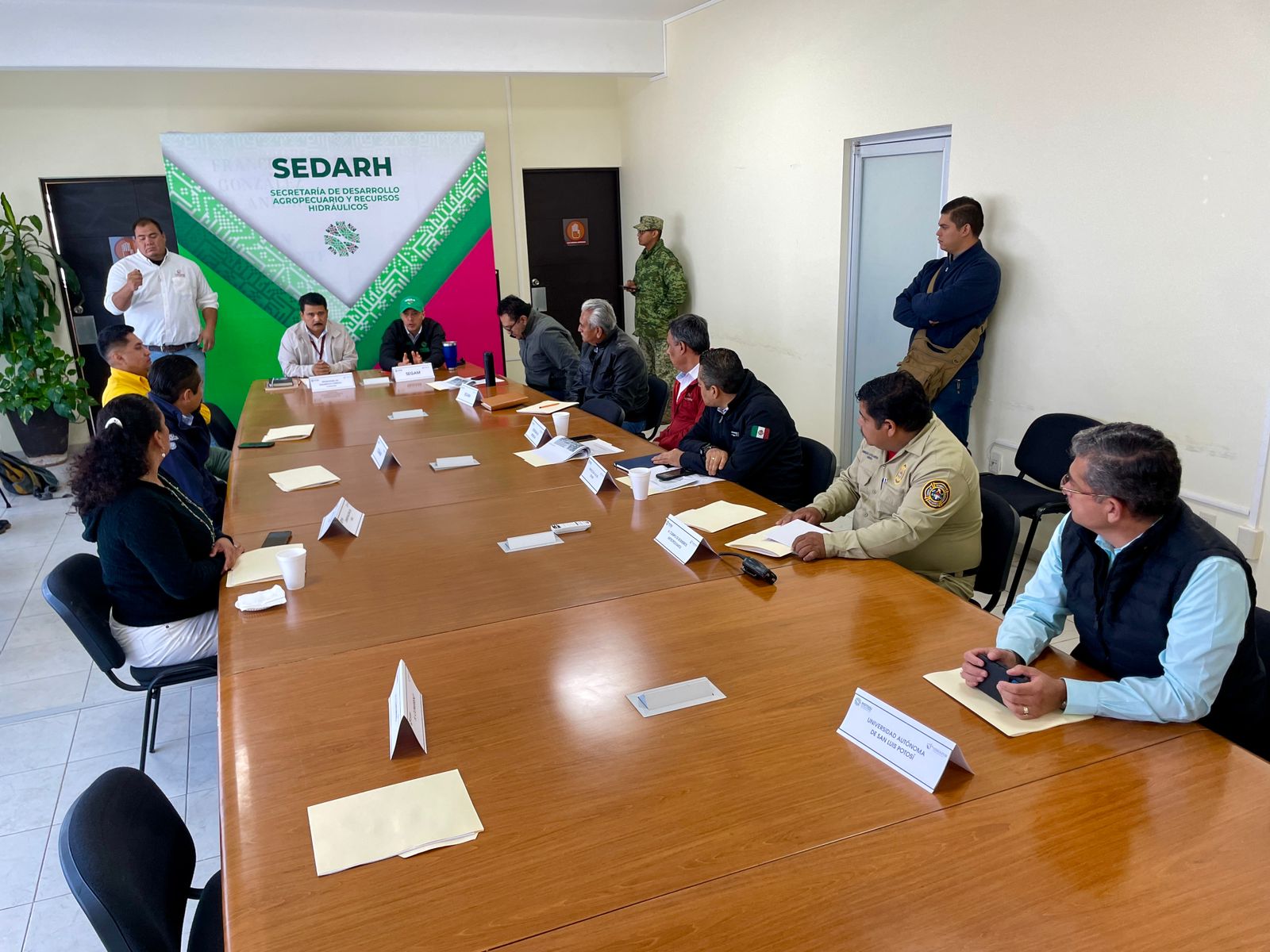 La reunión se llevó a cabo en la Secretaría de Desarrollo Agropecuario y Recursos Hidráulicos (Sedarh), al que acudieron Teodoro Morales Organista, titular de la Promotora de Desarrollo Forestal en San Luis Potosí de la Comisión Nacional Forestal (Conafor); Mauricio Ordaz Flores, director de la Coordinación Estatal de Protección Civil (CEPC); además de representantes de la Universidad Autónoma de San Luis Potosí (UASLP) y de la Secretaría de la Defensa Nacional (Sedena).