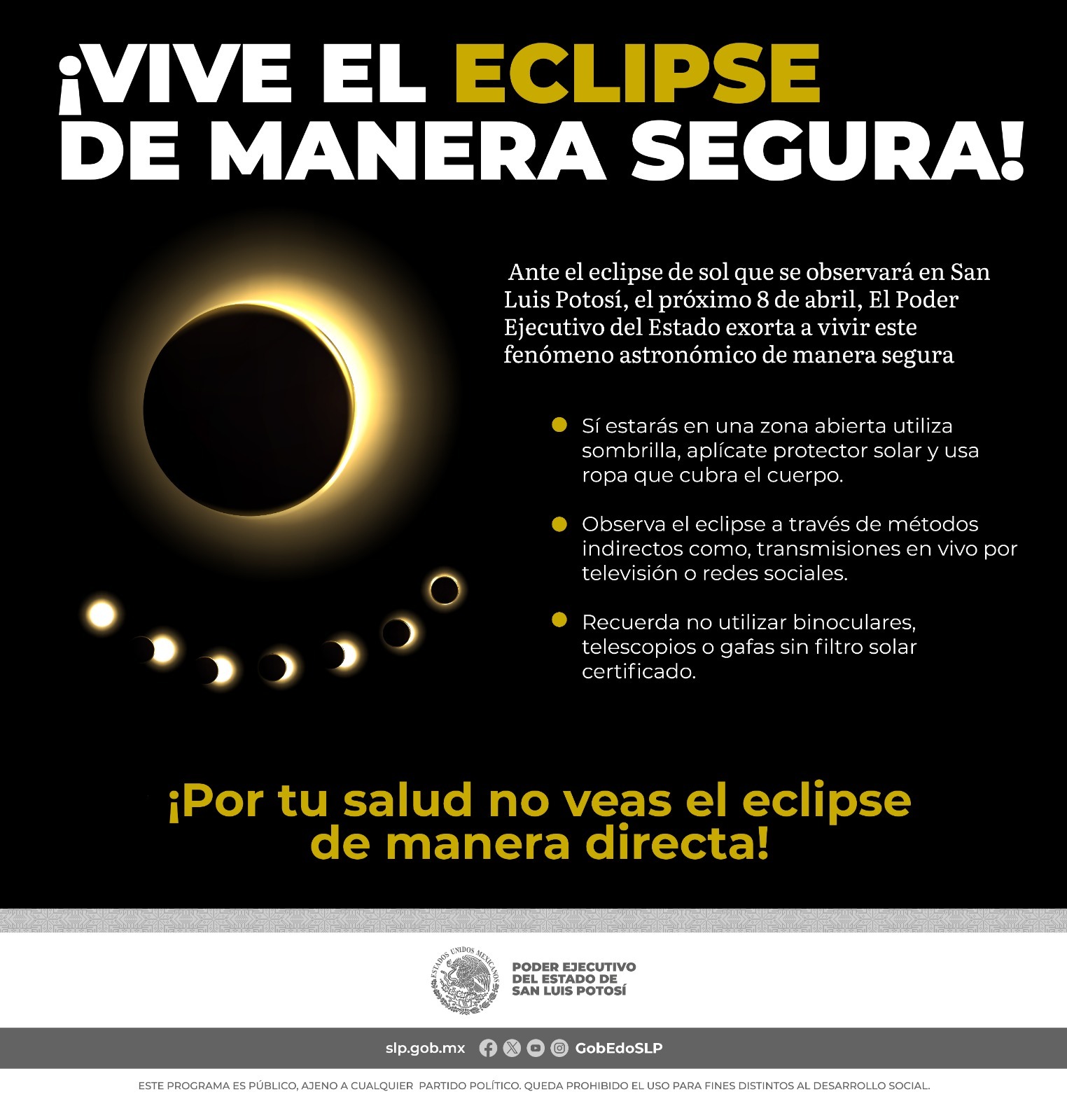 El Poder Ejecutivo del Estado invita al público en general y visitantes a presenciar el eclipse total de sol el próximo 8 de abril, en diversos recintos astronómicos de San Luis Potosí, para observar con seguridad, sin afectar la salud visual de las y los potosinos, el cual comenzará de las 10:51 a las 12:11 horas, con un grado de cobertura de luz solar del 87.6 por ciento.