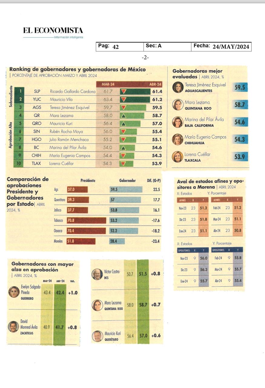 En el estudio correspondiente al mes de abril de 2024, Gallardo Cardona, obtuvo 8.9 puntos porcentuales más que el promedio de las y los Gobernadores que fue de 52.5 por ciento, además de que logró posicionar a San Luis Potosí entre las únicas dos entidades con calificación sobresaliente, a través de un porcentaje mayor del 60 por ciento de aval ciudadano.
