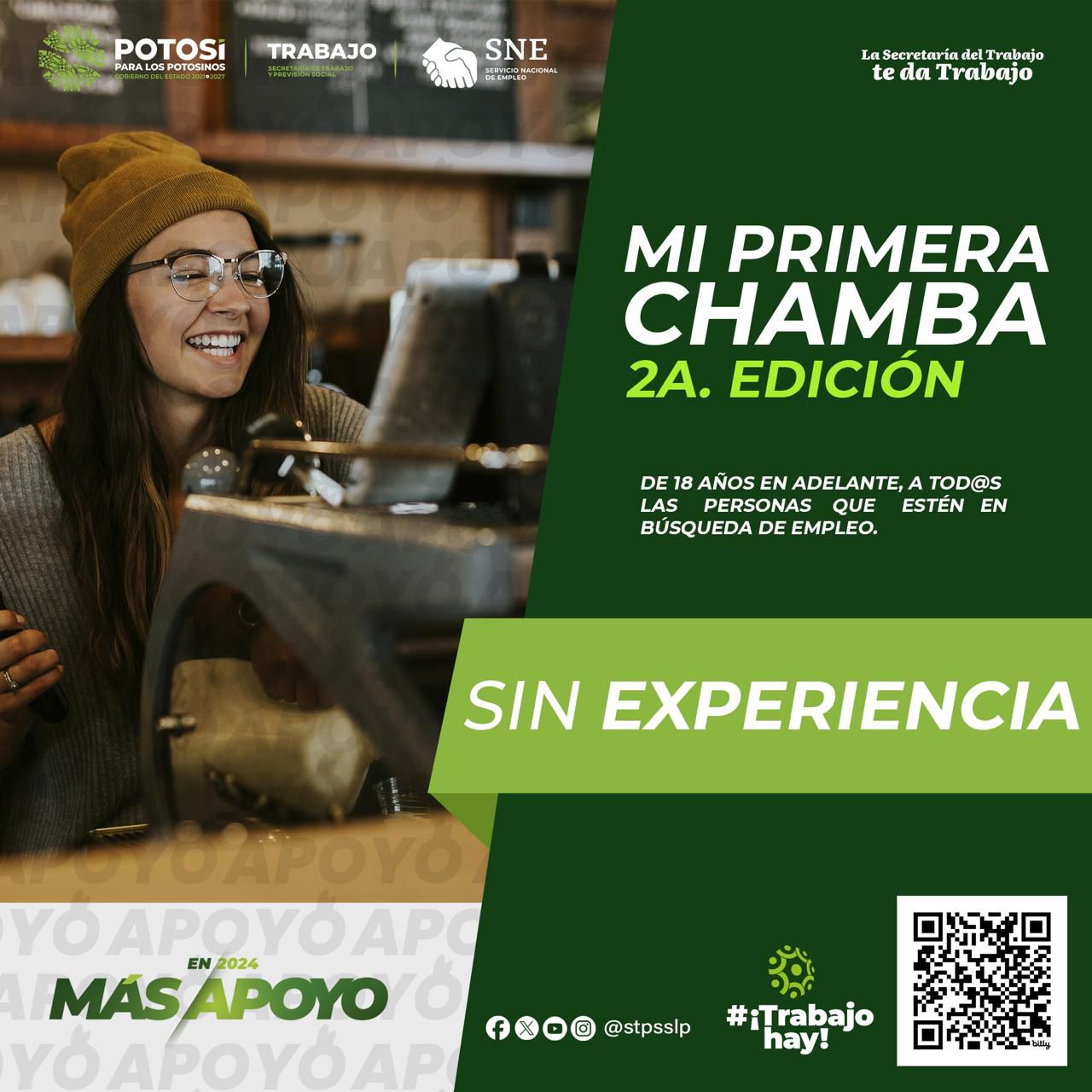 En continuidad a las exitosas estrategias de promoción del empleo emprendidas por el Gobierno del Estado, la Secretaría del Trabajo y Previsión Social (Stps), anunció el regreso del programa «Mi Primera Chamba» en su segunda edición, que busca brindar apoyo a las y los potosinos para que consigan su primer empleo formal, dirigido a jóvenes en periodo vacacional de verano, personas que han dejado o concluido sus estudios, y aquellas sin experiencia laboral previa.