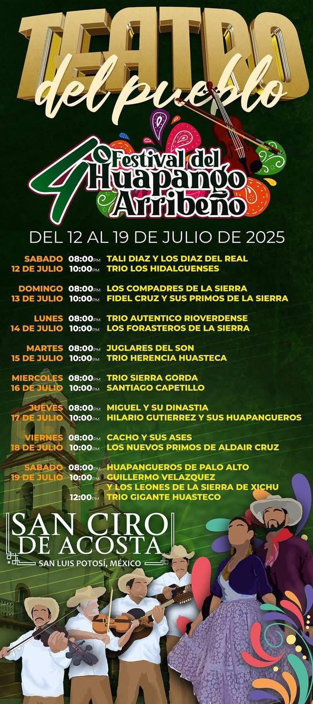 Y en San Ciro de Acosta, el 12 de julio comienza el 4.º Festival del Huapango Arribeño, que enaltece el folclore y las raíces musicales del Estado.
