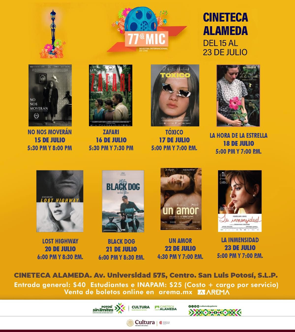 En la capital potosina, este viernes 18 de julio se proyectará la película La hora de la estrella en la Cineteca Alameda, con funciones a las 17:00 y 19:00 horas, como parte de la 77 Muestra Internacional de Cine. El mismo día, el Museo Leonora Carrington ofrecerá una Noche de Maridaje a las 19:00 horas, junto a Cava Quintanilla. Además, en Soledad de Graciano Sánchez se celebrará la tradicional Feria de las Flores, con talleres, música y actividades para toda la familia.