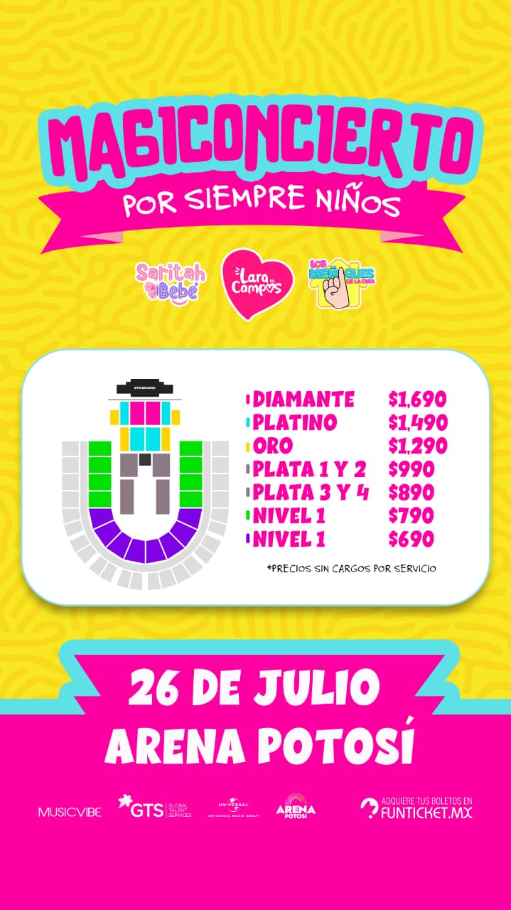 La magia y alegría llegarán a la Arena Potosí el 26 de julio con el Magiconcierto de Lara Campos, Los Meñiques de la Casa y Saritah Bebé, quienes llenarán el escenario de música y energía para que los más pequeños de la casa disfruten sin límites junto a sus familias.
